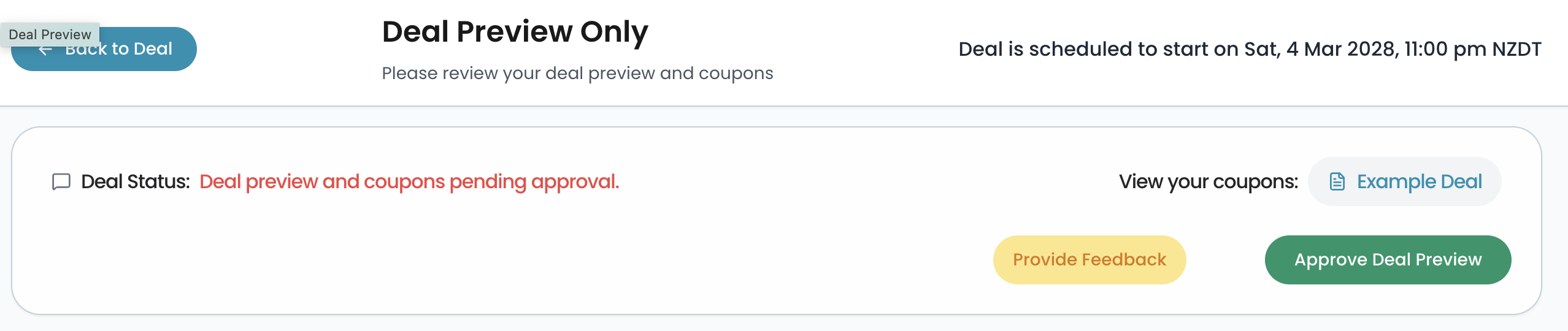 Once our team has created a final draft of your deal, complete with copy and images, you will need to review and approve your Deal Preview and Coupons.